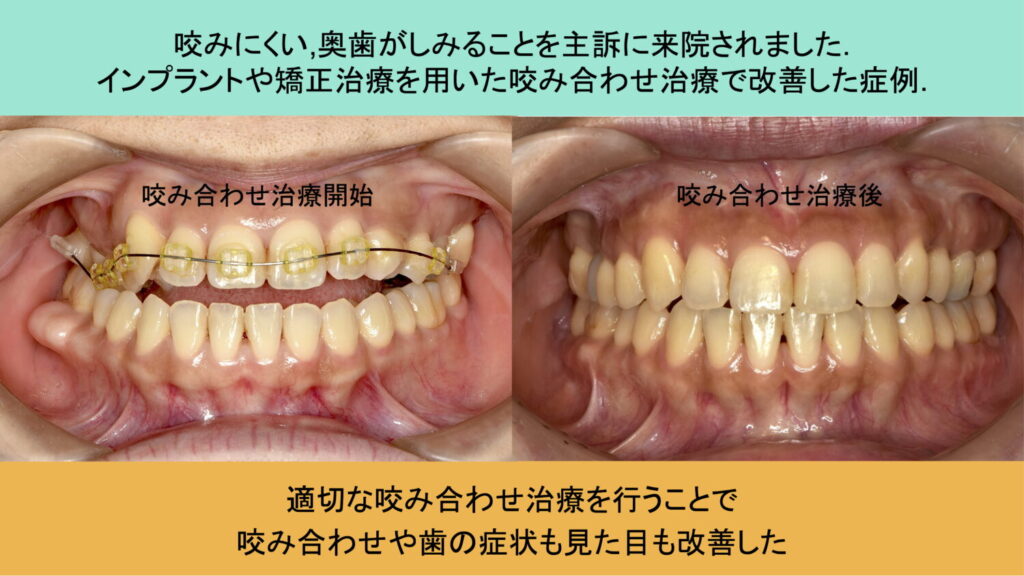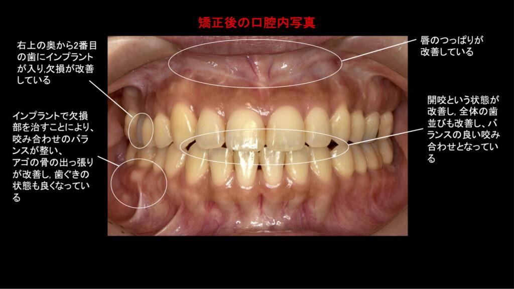 今回、矯正治療(外科矯正も含む)、インプラントを用いた咬み合わせの治療により、しみる症状や見た目が改善しました。患者様は歯のしみる症状や物を咬んだ時の痛みも消え、抜歯もすることなく、結果的に見た目も良くなり、大変嬉しいとおっしゃられています。